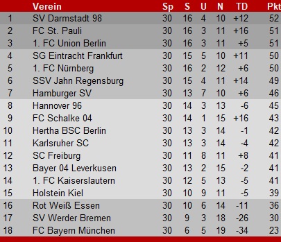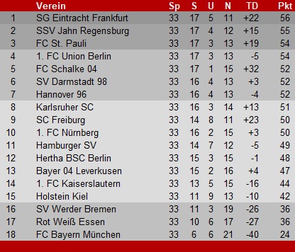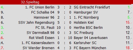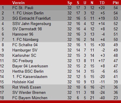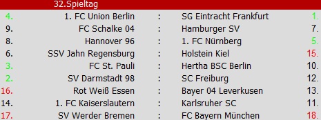 Wie wird oben gestartet: Die neue Tabellenführer aus Frankfurt kann sich im Top-Duell gegen die Eisernen nicht durchsetzen! Damit öffnet man die Tür für das Verfolgerfeld! Darmstadt nutzt dies nicht und strauchelt weiter durchs Finale! St. Pauli mit einem fetten Ausrufezeichen übernimmt nun die Führung! union kann mit dem Sieg gegen die direkte Konkurrenz auch an der Eintracht vorbeiziehen! Nürnberg hingegen verliert und muss Regensburg und Hannover vorbeiziehen lassen, die beide ihre Spiele gewinnen! Der HSV hingegen geht beim Verfolger aus Gelsenkirchen unter und muss seinen europäischen Platz erstmal streichen! Auch der KSC und Freiburg bleibt dran an Europa. Hertha hingegen strauchelt und muss erstmal abreißen lassen. Im Keller droht der Abstieg für die Bremer! Mit aller Macht stemmt man sich dagegen und gewinnt auch sein zweites Saisonfinalspiel! Essen verliert zeitgleich beim KSC und auhc die Störche können nicht punkten! Damit sind die Bremer nun tatsächlich in Schlagdistanz zum rettenden Ufer! Muss lautern nach zwei Auftaktniederlagen auch noch zittern? Die Ergebnisse und die Tabelle nach dem 32. Spieltag:
