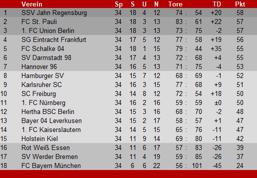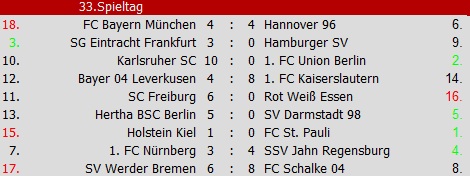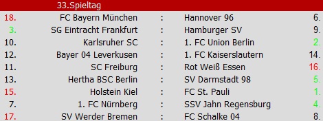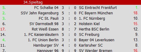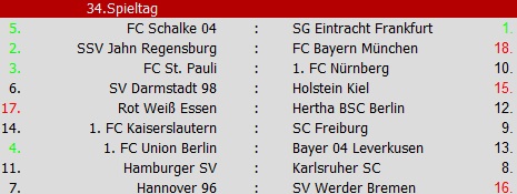 Auf gehts in den letzten Spieltag der Saison: Frankfurt in Gelsenkirchen und Regensburg empfängt die Bayern! zeitgleich empfängt St. Pauli Nürnberg und Union Berlin hat Leverkusen zu Gast! Union Berlin kann den Druck aufrecht erhalten und besiegt Leverkusen mit 3.0! Holt man die Schale in die Hauptstadt? Nein, denn St. Pauli kontert und schlägt den Clubb und ist somit der Titelanwärter! Kommt die Schale in die Hansestadt? Erneut ein Nein, denn auch Regensburg bewzingt die Bayern und blickt nun voller Hoffnung nach Gelsenkirchen! Schalke in einer bestechenden Form lässt der SGE keine Chance und siegt mit 3:0! Damit steht der neue Meister fest: