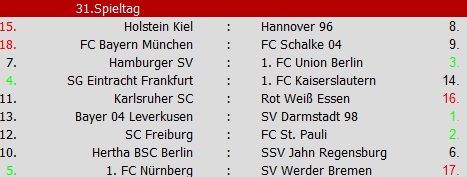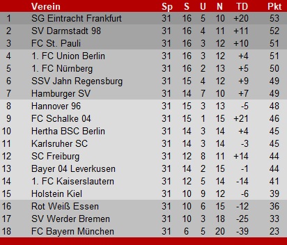 Beginnen wir oben: Darmstadt zu Gast bei Leverkusen und St. Pauli beim SC Freiburg! Beide Titelanwärter stolpern ins Finale. Darmstadt schlägt sich zwar wacker, aber muss sich dennoch knapp geschlagen geben (0:1), während St. Pauli unter die Räder kommt (0:6!). Auch für Union Berlin, dem Drittplatzierten, verläuft der Start denkbar ungünstig. Knapp muss man sich dem HSV geschlagen geben! Die Chance also für die SGE die Tabellenführung zu übernehmen! Wie beflügelt spielt man die roten Teufel an die Wand und übernimmt Platz 1! Nürnberg und auch Regensburg können ebenfalls keine Punkte einfahren und so bleibt die SGE der Gewinner im oberen Tabellenbereich! Der HSV sichert sich, wie oben beschrieben erstmal weiter seinen europäischen Platz! Aber aufgepasst! Das Verfolgerfeld mit Hannover, Schalke, Hertha, dem KSC und auch Freiburg können allesamt drei Punkte einfahren! Im Keller kann München zu Beginn des Finals keine Punkte einfahren. Auf Platz 17 greift Bremen nach dem letzten Strohhalm und holt drei ganz wichtige Punkte, denn Essen und auch Kiel gehen leer aus! Die Ergebnisse und die Tabelle nach Spieltag 31:
